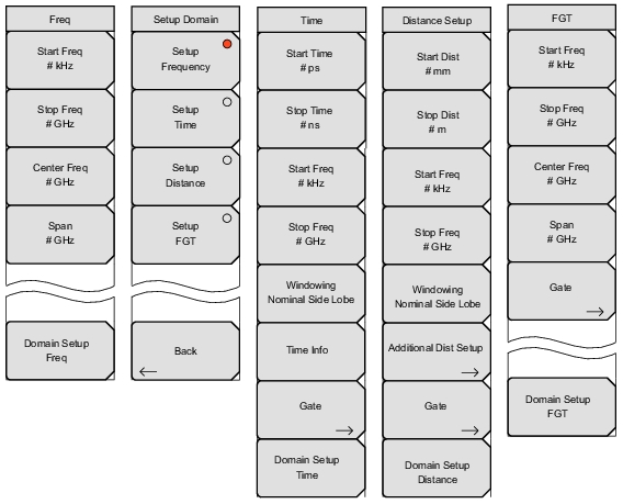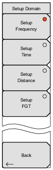 ![]() | Setup Frequency Press this soft key to open the Frequency menu and to use those soft keys to set start, stop, and center frequencies and frequency span. Choosing Setup Frequency sets the domain (x‑axis) of the active trace to Frequency (just as the Domain Selection soft key does in the Measure Menu). Setup Time Press this soft key to open the Time Menu and to set the start and stop times, the start and stop frequencies, windowing, and gating. Choosing Setup Time sets the domain (x‑axis) of the active trace to Time (just as the Domain Selection soft key does in the Measure menu). Setup Distance Press this soft key to open the Distance Setup Menu and to set the Start and Stop distances, the start and stop frequencies, windowing, and gating. The Start and Stop distances are set in meters (m), centimeters (cm), or millimeters (mm). If the Application Options menu is used to set units in feet rather than meters, the distance settings are in feet (ft) only. Choosing Setup Distance sets the domain (x‑axis) of the active trace to Distance (just as the Domain Selection soft key does in the Measure menu). Setup FGT Press this soft key to open the Frequency Gated by Time (FGT) menu and to use those soft keys to set start, stop, and center frequencies, and to set frequency span and gating. Choosing Setup FGT sets the domain (x‑axis) of the active trace to Frequency (just as the Domain Selection soft key does in the Measure menu). Note that the frequency data are not the measured frequency data (as in the Setup Frequency case), but they are time or distance domain data that are gated and converted back into the frequency domain. When the trace is in the Time domain and then set to FGT, the frequency data are generated by converting the gated time domain data. When the trace is in the Distance domain and then set to FGT, the frequency data are generated by converting the gated distance domain data. If the trace was set to Frequency and then converted to FGT directly, then the instrument defaults to converting the gated distance domain data. Back Press this soft key to return to the previous menu. |