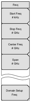 ![]() | Start Freq Press this soft key to set the start frequency in units of Hz, kHz, MHz, or GHz. If you enter a start frequency that is higher than the currently‑set stop frequency, and if CAL = On, then the start frequency is set to the same value as the stop frequency. If you enter a start frequency that is higher than the currently‑set stop frequency, and if CAL = Off, then both start and stop frequency are set to the new frequency. Stop Freq Press this soft key to set the stop frequency in units of Hz, kHz, MHz, or GHz. If you enter a stop frequency that is lower than the currently‑set start frequency, and if CAL = On, then the stop frequency is set to the same value as the start frequency. If you enter a stop frequency that is lower than the currently‑set start frequency, and if CAL = Off, then both stop and start frequency are set to the new frequency. Center Freq Press this soft key to set the center frequency in units of Hz, kHz, MHz, or GHz. The center frequency can be set with the arrow keys, the rotary knob, or the number keypad. When using the number keypad, the menu displays soft keys with Hz, kHz, MHz, and GHz units. Pressing the Enter key has the same effect as pressing the MHz soft key. Span Press this soft key to set the span in units of Hz, kHz, MHz, or GHz. The span setting determines the frequency range over which the instrument sweeps. The span may be set from 0 (zero) to the maximum frequency of the instrument. Domain Setup Press this soft key to open the Setup Domain Menu. The message on the key face reflects the setup feature (Freq) that is in use. |