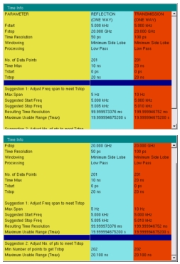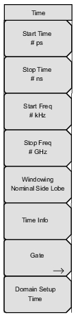 ![]() | Start Time Press this soft key to set the start time in seconds (s), milliseconds (ms), microseconds (µs), nanoseconds (ns), or picoseconds (ps). Use the arrow keys, the rotary knob, or the number keypad to set a time value. When using the number keypad, the menu displays soft keys with s, ms, µs, ns, and ps units. Pressing the Enter key has the same effect as pressing the ps soft key. The set value is displayed on the key face. Stop Time Press this soft key to set the stop time in seconds (s), milliseconds (ms), microseconds (µs), nanoseconds (ns), or picoseconds (ps). The maximum setting is ± 100 µs. Start Freq Press this soft key to set the start frequency in units of Hz, kHz, MHz, or GHz. Stop Freq Press this soft key to set the stop frequency in units of Hz, kHz, MHz, or GHz. Windowing Press this soft key to open the Windowing MenuWindowing Menu. The window shape value is displayed on the key face, and may be Rectangular, Nominal Side Lobe (as in this example), Low Side Lobe, or Minimum Side Lobe. Time Info Press this soft key to display the Time Info List BoxTime Info List Box. This list box displays useful information and suggestions regarding the time domain setup, such as the start and stop frequencies, start and stop time, number of data points, windowing and processing types, maximum time, and time resolution. Use the Up/Down arrows or the rotary knob to scroll through the listed parameters. Gate Press this soft key to open the Gate Menu. Domain Setup Press this soft key to return to the Setup Domain Menu. The message on the key face reflects the setup feature (Time, in this example image) that is in use. |