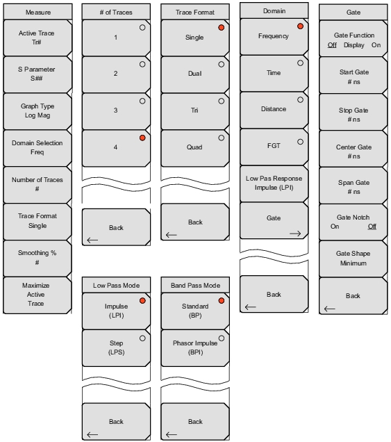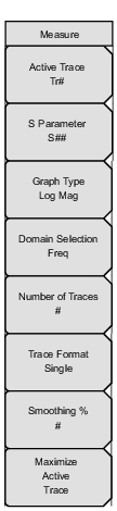 ![]() | Active Trace Press this soft key to open the “Active Trace Selector” List Box and choose a trace. Use the arrow keys or the rotary knob to scroll through the list. Press the rotary knob or the Enter key to select a trace. Press the Esc key to close the list box and return to the Measure Menu without changing the trace selection. S‑Parameter Press this soft key to open the S‑Parameter List Box or the S‑Parameter Menu and select a measurement type. Refer to Section S‑Parameters for a description of the S‑Parameter settings. Graph Type Press this soft key to open the “Graph Type Selector” List Box and choose a graph (trace display) type. Examples of graph type are: Log Mag, Real, Imaginary, and Smith Chart. Domain Selection Press this soft key to open the Domain Menu and select Frequency, Time, or Distance as the measurement domain. Each trace can use a different domain. Number of Traces Press this soft key to open the Number of Traces Menu and select the number of traces (1, 2, 3, or 4) to be simultaneously displayed in the sweep window. Trace Format Press this soft key to open the Trace Format Menu and choose the screen format for trace display. The selected Trace Format is shown on the soft key face. Smoothing % Press this soft key to add a smoothing percentage from 0 (zero) to 20 %. Use the arrow keys, the rotary knob, or the number keypad to input the value, and then press the rotary knob or the Enter key. Maximize Active Trace Press this soft key to toggle the display between the active trace at full size in the sweep window and the minimized trace. The Trace Format soft key continues to show the selected Trace Format on the soft key face, and this soft key label changes between Maximize and Minimize Active Trace. |