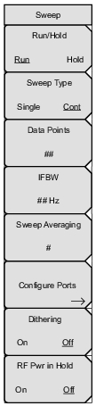 ![]() | Run/Hold Run Hold Press this soft key to toggle the sweep to Run or Hold. Sweep Type Single Cont Press this soft key to toggle the sweep type to Single or Continuous. Single sweep sets the VNA Master to make a single sweep and then wait for additional commands. The Continuous mode sweeps continuously. Data Points Press this soft key to set the number of data points from 2 to 4001. IFBW Press this soft key to open a list box and set the Intermediate Frequency bandwidth. The default is 10 kHz. Select 10 Hz for the maximum dynamic range, and select 100 kHz for the maximum speed. Sweep Averaging Press this soft key to set the number of sweeps to use for averaging. The minimum number is 1. Configure Ports Press this soft key to open the Configure Ports Menu. Dithering On Off Press this soft key to toggle On and Off the Dithering function. When a signal is dithered, a mathematical process removes the harmonics or other undesirable distortions, and replaces these distortions with a constant, fixed noise level. The result is a better representation of the signal. RF Pwr in Hold On Off Press this soft key to toggle On and Off the condition of the RF power transmitted from Port 1 and Port 2 when the instrument is put in Hold mode. The RF power can be set either to stay on or to be turned off during Hold. The default setting is for the RF to stay on during Hold, which helps to stabilize the instrument temperature. |