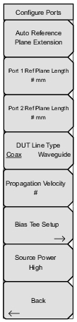 ![]() | Auto Reference Plane Extension Press this soft key to use the active trace data to automatically determine the best length to mathematically extend the reference plane (plane of calibration) in order to remove cable length from the measurement, based on the current value of Propagation Velocity (refer to the description for the Propagation Velocity soft key). The resultant display will “unwrap” phase displays to allow a better view of the phase properties of the DUT. Port 1 Ref Plane Length Press this soft key to manually enter a distance to which the Reference Plane (Plane of Calibration) is extended. This action calculates and removes (from the measurement data) an appropriate amount of linear phase rotation based on Propagation Velocity and the distance that is entered here. Port 2 Ref Plane Length Press this soft key to enter reference plane extension distance for Port 2 (full-reversing, two‑port VNA instruments only). DUT Line Type Press this soft key to toggle the line type to coaxial cable or to waveguide. Propagation Velocity This value is used by the Reference Plane Extension functions. Press this soft key to enter the propagation velocity of electrical signals in the length of cable that is being removed by the Reference Plane Extension calculations. Values are expressed as a decimal ratio compared to the speed of light in a vacuum (examples: 1 = speed of light, and 0.5 = 1/2 the speed of light). Bias Tee Setup Press this soft key to open the Bias Tee Setup Menu. Source Power Press this soft key to open the Source Power Menu (MS20xxC only) or Source Power Menu (MS20xxB and S412E only). Back Press this soft key to return to the Sweep Menu — MS20xxC. |