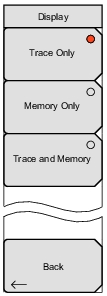 ![]() | Trace Only Press this soft key to set the trace function to display only the current trace. Memory Only Press this soft key to set the trace function to display only the trace that is in memory. Trace and Memory Press this soft key to set the trace function to display the current trace and the trace that is in memory. Back Press this soft key to return to the Trace Menu without changing the current setting. |