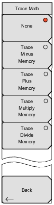 ![]() | None Press this soft key to set the trace math function to use only the current trace. Trace Minus Memory Press this soft key to set the trace math function to subtract the trace that is in memory from the current trace. Trace Plus Memory Press this soft key to set the trace math function to add the trace that is in memory to the current trace. Trace Multiply Memory Press this soft key to set the trace math function to multiply the current trace by the trace that is in memory. Trace Divide Memory Press this soft key to set the trace math function to divide the current trace by the trace that is in memory. Back Press this soft key to return to the Trace Menu. |