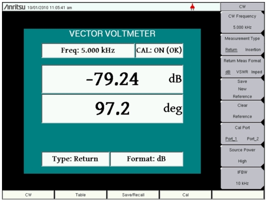 When you choose the Measurement Type and the Cal Port, the Vector Network Analyzer compares these measurement settings with the current calibration. If a match is found, then the current calibration is applied to the measured data, and the Cal info box on the display (refer to Figure: Continuous Wave Menu – MS20xxC VNA Master) shows “CAL: ON (OK)”. If no match is found (for example, the calibration was for S11, but the Cal Port is set to Port 2), then the display shows “CAL: --”. Adjusting the setting (the Measurement Type or the Cal Port) to match the calibration automatically applies the correction. The calibration correction can also be turned off manually under the Calibration menu by toggling the Cal Correction soft key from On to Off. In that case, the display shows “CAL: OFF”.