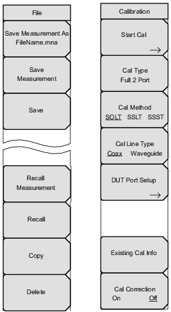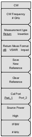 ![]() | CW Frequency Press this soft key to set the desired measurement frequency. Enter the desired frequency using the keypad, the arrow keys, or the rotary knob. If entering a frequency using the keypad, then the soft key labels change to GHz, MHz, kHz, and Hz. Press the appropriate units key. Pressing the Enter key has the same affect as using the MHz soft key. Measurement Type Return Insertion Press this soft key to toggle between Return and Insertion measurements. When Return is selected, the Return Meas Format soft key is displayed. Return Meas Format dB VSWR Imped Press this soft key to toggle among dB, VSWR, and Imped (impedance) measurements formats. This setting is relevant (and the soft key is displayed) only when the Measurement Type soft key is set to Return. Save New Reference Press this soft key to save the current measurement as the reference measurement. Entering a reference puts the Vector Voltmeter in relative measurement mode. Clear Reference Press this soft key to remove the reference measurement from memory. The Vector Voltmeter exits the relative measurement mode. Cal Port Port_1 Port_2 Press this soft key to set the transmission port for subsequent measurements. For making S11 or S21 measurements, set this to Port 1. For S22 or S12 measurements, set this to Port 2. This soft key is displayed only with the MS20xxC VNA Master and is not relevant to the MS20xxB VNA Master. Source Power Press this soft key to open the Source Power Menu (MS20xxB and S412E only). The Source Power menu in VVM mode is the same as in VNA mode. IFBW Press this soft key to open a list box and set the Intermediate Frequency bandwidth. The default is 10 kHz for the MS20xxC series instruments and 1 kHz for the MS20xxB and S412E series instruments. Select 10 Hz for the maximum dynamic range; select 100 kHz for the maximum speed. |