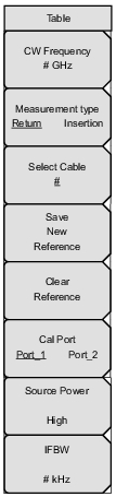 ![]() | CW Frequency Press this soft key to set the desired measurement frequency. Enter the desired frequency using the keypad, the arrow keys, or the rotary knob. If entering a frequency using the keypad, then the soft key labels change to GHz, MHz, kHz, and Hz. Press the appropriate units key. Pressing the Enter key has the same affect as using the MHz soft key. Measurement Type Return Insertion Press the Measurement Type soft key to toggle between return and insertion. Select Cable Press this soft key to open the Select Cable List Box. One of the twelve cable numbers is underlined to indicate which cable is selected. Change to a different cable by pressing the Select Cable soft key. The data for the selected cable is highlighted in that cable row within the displayed table. Save New Reference Press this soft key to save the current measurement as the reference measurement. Entering a reference puts the Vector Voltmeter in relative measurement mode. Clear Reference Press this soft key to remove the reference measurement from memory. The Vector Voltmeter exits the relative measurement mode. Cal Port Port_1 Port_2 Press this soft key to set the transmission port for subsequent measurements. For making S11 or S21 measurements, set this to Port 1. For making S22 or S12 measurements, set this to Port 2. This soft key is displayed only with the MS20xxC VNA Master and is not relevant to the MS20xxB VNA Master. Source Power Press this soft key to open the Source Power Menu (MS20xxB and S412E only). The Source Power menu in VVM mode is the same as in VNA mode. IFBW Press this soft key to open a list box and set the Intermediate Frequency bandwidth. The default is 10 kHz. Select 10 Hz for the maximum dynamic range, and select 100 kHz for the maximum speed. |