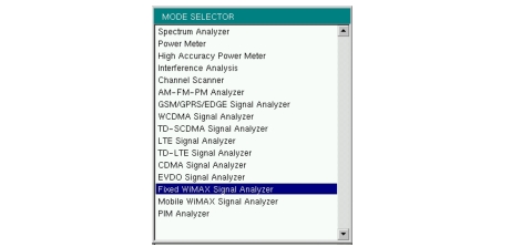 Select either Fixed WiMAX Analyzer or Mobile WiMAX Analyzer mode by pressing Shift and then the Mode (9) button to open the Mode Selector dialog box. Highlight the desired measurement mode using the Up or Down arrow keys and press Enter.