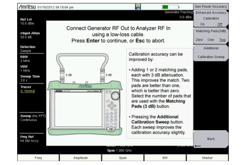 3. Select the number of external Matching Pad (3 dB) pads to use for calibration and measurements. Press Enhanced Accuracy Calibration. External attenuators will need to be inserted for the 3 dB and 6 dB pad options.