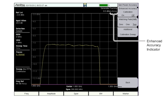 During the Enhanced Accuracy Calibration process, the instrument calibrates across the frequency range, reducing any output ripple. After the successful completion, the (+Accy) label will be displayed after the Generator output power (Figure: After Enhanced Accuracy Calibration).
