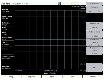 1. Connect a through cable between GENERATOR/RF OUT and ANALYZER/RF In connectors. From the Generator submenu, press the Transmission Measurement submenu key and then set NormalizeOn.