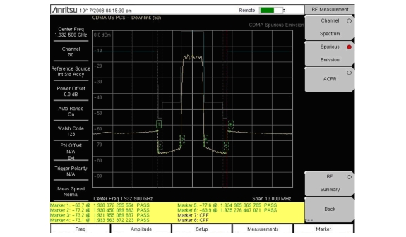 This measurement displays the spectrum of the input signal at specific offsets (based upon the Signal Standard, which is selected from the frequency (Freq) menu). Markers are automatically tuned to measure the input power at these offsets and to determine a PASS or FAIL according to limits that are set by the signal standard. A blue mask is also calculated and shown on the spectrum to visually check for pass fail conditions.