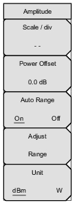 ![]() | Scale/div: The scale can be set in 1 dB steps from 1 dB per division to 15 dB per division. The value can be changed using the keypad, the rotary knob, or the Up/Down arrow keys. Scale changes the y-axis scale. This applies to the Spectrum view only. When in any other view, the display is “--”. Power Offset: Choose power offset to automatically adjust for the loss that occurs through any external cables, attenuators, and couplers. The power can be offset from 0 dB to 100 dB. Press the Power Offset key, enter the values, and press the dB submenu key. Auto Range: Pressing this submenu key toggles between On and Off. This function adjusts the reference level automatically when Auto Range is activated. Adjust Range: When Auto Range is OFF, pressing Adjust Range sets the Reference Level automatically for that one particular measurement. Pressing this button when Auto Range is ON, will turn Auto Range to OFF Units: select either dBm or Watts as the power unit. |