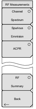 ![]() | Channel Spectrum: Pressing this submenu key displays the channel spectrum of the input signal (2.5 MHz span). The screen also displays numeric values of Channel Power in dBm and watts, Peak to Average power in dB, and Occupied Bandwidth (Occ BW). The Ch Spectrum submenu allows OBW Span to toggle between 2.5 MHz and 1.35 MHz. Spurious Emission: Pressing this submenu key displays the received signal and the mask, based upon received signal strength. ACPR: Pressing this submenu key displays the Adjacent Channel Power Ratio (ACPR). The instrument displays one or more main channels and two adjacent channels on each side of the main channel. A data window below the channel measurement display indicates the power in each channel. When this submenu key is active (an arrow on the key symbol indicates that a sub menu is available), another key press opens the ACPR Menu. RF Summary: Displays a summary table of all the RF numerical measurement results. Back: Returns to the Measurements Menu. |
