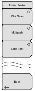 ![]() | Pilot Scan: Displays the power of the 9 strongest PNs in histogram graphical format. The strongest PN or the user-selected PN is color coded blue, those colored red are probably real pilots, and the remaining, which are color coded gray, are probably noise. Multipath: Displays 6 multipaths in histogram graphical format. The strongest is color coded blue. The remaining are color coded red, or are color coded gray if noise. The unit also displays Ec/Io (dB), Tau, Channel Power, and Multipath Power. Limit Test: Press once to select the Limit Test. Press again to open the Limit Test Menu for Limit Test configuration. Back: Returns to the Measurements Menu. |