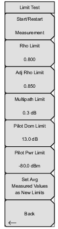 ![]() | Start/Restart Measurement: Starts or restarts the measurement. Press the submenu keys to set the desired limit: Rho Limit Adj Rho Multipath Limit Pilot Dom Limit Pilot Pwr Limit Set Avg Measured Values as Limits: Takes the calculated average values for Rho, Adjusted Rho, Multipath, Pilot Dominance, and Pilot Power in the Avg row and places them in the Limits row. Back: Returns to the Over-The-Air Menu. |