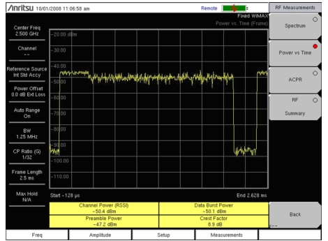 The Power versus Time view shows the time domain view of a WiMAX 802.16‑2004 OFDM signal over approximately one frame. The preamble is always 3 dB higher than the data. The screen also displays Channel Power (RSSI), Data Burst Power, Preamble Power, and Crest Factor.