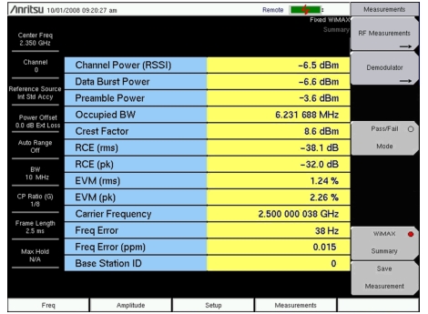 The WiMAX Summary is a summary list of critical Fixed WiMAX measurements from the RF and Demodulation measurements.
