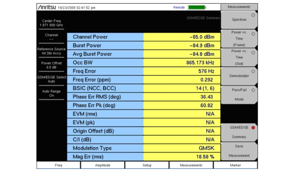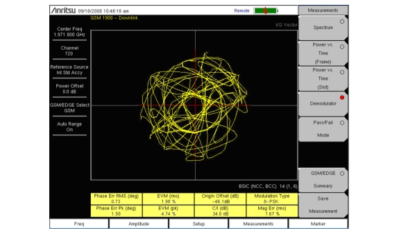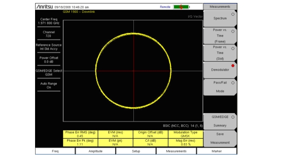 This measurement demodulates the GSM/GPRS/EDGE signal and displays the vector with Phase Error, EVM, Origin Offset, C/I, Modulation Type and Magnitude Error (as applicable). See Figure: GSM Demodulator Measurement and Figure: EDGE Demodulator Measurement. To demodulate the GSM/EDGE signal: