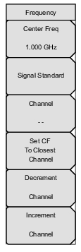 ![]() | Center Freq: Press the Freq key followed by the Center Freq submenu key and enter the desired frequency using the keypad, the arrow keys, or the rotary knob. If entering a frequency using the keypad, the submenu key labels change to GHz, MHz, kHz, and Hz. Press the appropriate units key. Pressing the Enter key has the same effect as pressing the MHz submenu key. Signal Standard: Use the Up/Down arrow keys or the rotary knob to highlight a signal standard and press Enter to select. When a signal standard is selected, the center frequency and span for the first channel of the selected standard is automatically tuned. Other settings, such as channel spacing and integration bandwidth, are also automatically entered. Appendix A contains a table of the signal standards that are in the instrument firmware. Channel: Use the Up/Down arrow keys, the keypad, or the rotary knob to select a channel number for the selected signal standard. The center of the channel is automatically tuned to the center frequency of the selected GSM/EDGE channel. Set CF To Closest Channel: Changes the center frequency to the closest channel. Decrement Channel: Decreases the channel number one channel. Increment Channel: Increases the channel number one channel. |