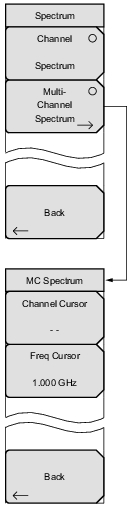 ![]() | Channel Spectrum: Displays the spectrum of the selected channel. The screen also displays Channel Power, Occupied Bandwidth, Frequency Error in PPM and Hz, Burst and Average Burst Power, and the Base Station Identity Code (BSIC). Multi‑Channel Spectrum: Displays the spectrum of ten GSM/EDGE channels. Opens the MC Spectrum Menu shown below: Channel Cursor: Select Channel Cursor to place the cursor at a specific channel location. Use the rotary knob or the Up/Down arrow keys to select the channel. Press the Enter key to select. Freq Cursor: Select Freq Cursor to place the cursor at a specific frequency. Use the rotary knob or the Up/Down arrow keys to select the frequency. Press the Enter key to select. Back: Returns to the Spectrum Menu. Back: Returns to the Measurements Menu. |