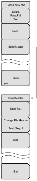 ![]() | Select Pass/Fail Test: Display the available test sets in the Select Pass/Fail Test window. Reset: Resets the Pass/Fail Mode test. ScriptMaster: Opens the Select File by Scrolling window and also lists Recall and Back submenu keys. Recall a Script file, created in Master Software Tools, from the window. The ScriptMaster instructions are loaded into the instrument and the ScriptMaster menu is listed. Start Test: Begins running the instructions listed in ScriptMaster. Change File Header: Opens the Pass Fail Test File Header entry window and lists the Text Entry menu to name the saved file after the ScriptMaster measurement process is complete. Skip: Skips over a ScriptMaster instruction. Exit: Ends the ScriptMaster measurement process. Returns the instrument to the previous measurement setup. Back: Returns to the Measurements Menu. |