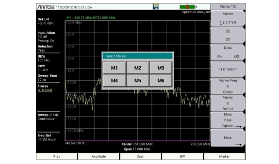 7. Press the Marker main menu key and press the Marker 123456 submenu key to select Marker 1. The underlined number indicates the active marker.