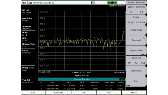 3. Press Sweep Once to initiate one measurement sweep of the currently selected segment, which is highlighted in yellow in the Spurious Emission table. See Figure: Spurious Emission Measurements.
