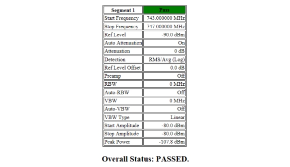 Measurements can be saved automatically by pressing the Auto Save submenu key and selecting either On or Full. The On setting saves an HTML file that contains a table for each segment measured. A status block in the table displays Pass or Fail for the individual segment. The Overall Status at the end of the file indicates whether the spurious emission mask passed or failed. See Figure: Spurious Emission Mask Segment Data - Auto Save On.
