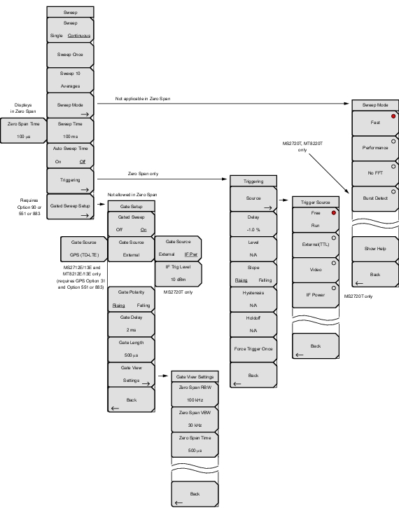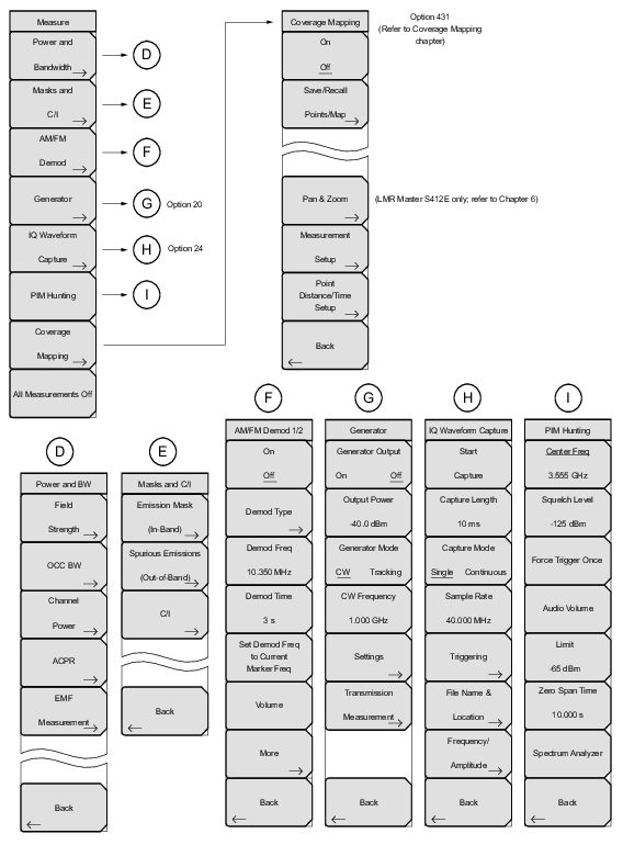 Figure: Main Menu Keys through Figure: System Menu, Application Options Submenu Keys show the maps of the Spectrum Analyzer menus. The following sections describe Spectrum Analyzer main menus and associated submenus. The submenus are listed in the order they appear on the display from top to bottom under each main menu. Menu maps typically display all possible submenu keys, although some keys are displayed on the instruments only under special circumstances (refer to menu descriptions).