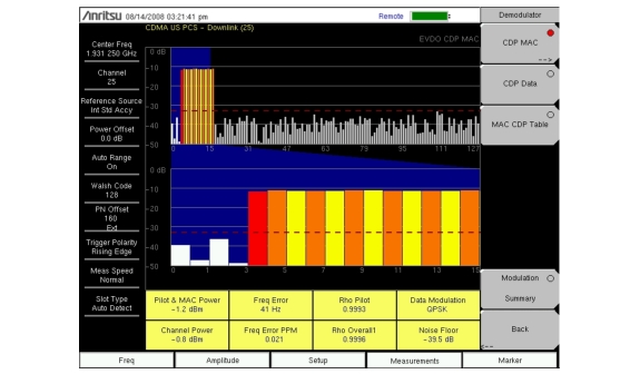EVDO demodulator measurements include, CDP MAC, CDP Data, MAC CDP table, and Modulation Summary. To demodulate EVDO signals, connect the instrument to the base station by using the following setup instructions: