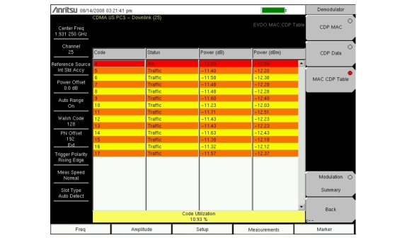 The MAC CDP Table View displays all of the active codes in a tabular format. From the Demodulator menu, press the MAC CDP Table submenu key to display the Code Domain Power table view (Figure: EVDO MAC CDP Table).