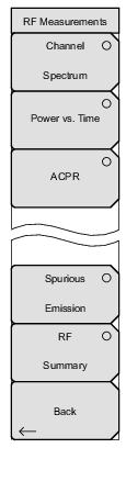 ![]() | Channel Spectrum: Pressing this submenu key displays the channel spectrum of the input signal (2.5 MHz span). The screen also displays numeric values of Channel Power in dBm and watts, Peak to Average power in dB, and Occupied Bandwidth (Occ BW). The Ch Spectrum submenu allows OBW Span to toggle between 2.5 MHz and 1.35 MHz. Power vs. Time: Pressing this submenu key displays a power versus time measurement. This view shows the time domain view of an EVDO half-slot. The Slot Type selection in the Setup menu determines the priority of which slot is displayed. Below the measurement display, numerical values are included for: Pilot and Mac Power in dBm Freq Error in Hz and PPM Channel Power in dBm ON/OFF Ratio: Power ratio (in dB) of Pilot and MAC power to the data power in an idle slot Idle Activity: Percentage of idle slots relative to total slots in the captured signal ACPR: Pressing this submenu key displays the Adjacent Channel Power Ratio (ACPR). The instrument displays one or more main channels and two adjacent channels on each side of the main channel. A data window below the channel measurement display indicates the power in each channel. When this submenu key is active (an arrow on the key symbol indicates that a sub menu is available), another key press opens the ACPR Menu. Spurious Emission: Pressing this submenu key displays the received signal and the mask, based upon received signal strength. RF Summary: Displays a summary table of all the RF numerical measurement results. Back: Returns to the Measurements Menu. |