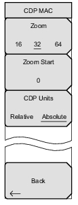 ![]() | Zoom: Press this submenu key to select one of these three settings to view 16, 32, or 64 carriers in the measurement display. Zoom Start: Press this submenu key, then enter the required zoom start index. For example, to start at code 2, which is the second code power that is displayed, press the 2 key on the numeric keypad, then press either the submenu Enter key (which appears when the numeric keypad is used) or the Enter key. In addition, press this key, then use the Arrow Keys or rotary knob to change the zoom start index. The CDP submenu key remains after pressing the rotary knob or the Enter key. CDP Units: Press this submenu key to toggle between Relative units (in dB) or Absolute units in (dBm). Select Relative to show CDP power values in dB relative to Pilot and MAC Power, or Absolute to show power values in dBm. Back: Returns to the Demodulator Menu. |