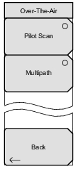 ![]() | Pilot Scan: Displays the power of the 9 strongest PNs in histogram graphical format. The strongest PN or the user-selected PN is color coded blue, those colored red are probably real pilots, and the remaining, which are color coded gray, are probably noise. PN, Ec/Io, and Tau are displayed below each PN bar graph signal. Pilot Power (dBm), Channel Power (dBm), and Pilot Dominance (dB) are displayed below the graph. Multipath: Displays six multipaths in histogram graphical format. The strongest is color coded blue. The remaining signals are color coded red, or they are color coded gray if they are due to system noise. The numerical results that are displayed in this view are Ec/Io (dB) and Tau for each path. Channel Power, and Multipath Power are displayed below the graph. Back: Returns to the Measurements Menu. |