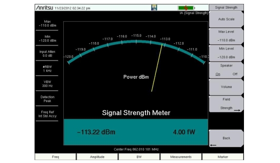 The Signal Strength meter is useful for tracking down the source of an interfering signal. This measurement is done at a single frequency in zero span. The power at a frequency (in dBm and Watts) is displayed along with an optional audible indicator. Connect a directional antenna and the frequency of the audible indicator increases as the measured signal strength increases. This mode is especially useful when attempting to locate an emitter using a directional antenna.