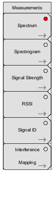 Pressing the Spectrum submenu key sets the instrument to a traditional spectrum analyzer display. When Spectrum is active, pressing the Spectrum submenu key opens a menu for Spectrum Analyzer measurements. See the