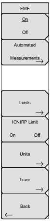 Turns EMF Measurement on and off. Refer to EMF Menu (Option 444). Refer to Electromagnetic Field (EMF) Measurements Option 444 Measurement Guide, 10580-00455