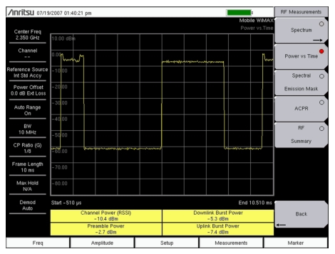 The Power versus Time view shows the time domain view of a Mobile WiMAX signal over approximately one frame. The screen also displays Channel Power (RSSI), Downlink Burst Power, Uplink Burst Power, and Preamble Power. The sample image in Figure: Mobile WiMAX Power versus Time Measurement may differ from any image on your instrument.