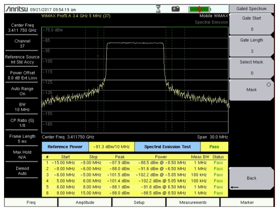 The Spectral Emission Mask (SEM) measurement supports the testing for Operating Band Unwanted Emissions described in the 802.16 testing document. The instrument displays the frequency masks on the spectrum display, and it indicates the reference power and whether the signal is within the specified limits by displaying PASS or FAIL. The emission mask information is also displayed in a table format with different frequency ranges, power levels, and measured bandwidth and whether the signal PASSED or FAILED in that region.