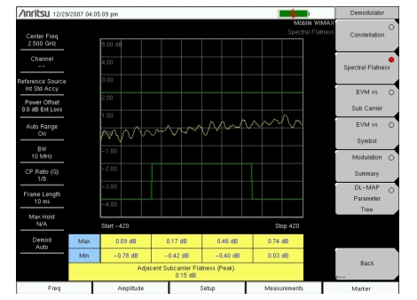 This mask is referenced from the average of all subcarrier amplitude values. The numerical result that is displayed in this view is the adjacent subcarrier flatness (in dB).