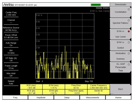 Figure: Mobile WiMAX Demodulator EVM versus Sub Carrier Measurement may differ from any image on your instrument.