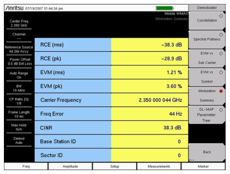 The Modulation Summary measurement displays the critical Modulation transmitter performance measurements in a table format by demodulating the WiMAX signal. The parameters that are displayed in the Modulation summary table are: RCE (rms) in (dB), RCE (pk) in (dB), EVM (rms) in (%), EVM (pk) in (%), Freq Error in (Hz), CINR, Carrier Frequency (Hz), and Sector ID. The sample image in