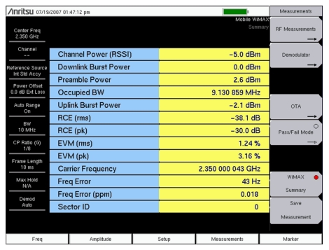 The WiMAX Summary is a summary of critical Mobile WiMAX measurements from the RF and Demodulator measurements: Channel Power (RSSI) in dBm, Downlink Burst Power in dBm, Preamble Power in dBm, Occupied BW in Hz, Uplink Burst Power in dBm, RCE (rms) in dB, RCE (pk) in dB, EVM (rms) in %, EVM (pk) in %, Carrier Frequency in Hz, Freq Error in Hz, CINR, Base Station ID, and Sector ID.
