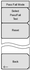 ![]() | Select Pass/Fail Test Press this submenu key to select a pass/fail test from the list of available Pass/Fail tests. The default list is: • PASS_FAIL_RF • PASS_FAIL_DEMOD • PASS_FAIL_ALL You can create a user‑defined file by using Master Software Tools. Refer to Pass / Fail Mode. Reset Press this submenu key to restart a Pass/Fail test. Back Press this submenu key to return to the Measurements Menu. |