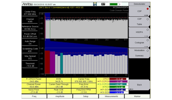 The Code Domain Power (CDP) display includes spreading factor (OVSF codes) 256 or 512 with zoom in on codes. The instrument can zoom to 32, 64 and 128 codes and the user can input the zoom code to start the zoom in from the entered OVSF codes. The demodulator also displays CPICH, P‑CCPCH, S‑CCPCH, PICH, P‑SCH and S‑SCH power in the table format. For W-CDMA/HSDPA Demodulator, the HSDPA codes are also displayed.