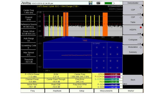 HSDPA displays the spreading factor (OVSF codes) 256 or 512 codes and high speed downlink physical shared channel codes HS‑PDSCH. The right or left active codes can be selected using the cursor. The selected code power versus time and constellation are displayed. The demodulator also displays CPICH, P‑CCPCH, S‑CCPCH, PICH, P‑SCH and S‑SCH power in table format.