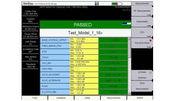 The instrument stores the five test models specified in the 3GPP specification (TS 125.141) for testing base station performance and recalls these models for quick easy measurements. After selection of a test model, the instrument displays test results in tabular format with clear PASS or FAIL indications that include min/max threshold.