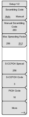 ![]() | Scrambling Code: Press the Scrambling Code submenu key to toggle between Auto and Manual Scrambling Code. Manual Scrambling Code: Press the Manual Scrambling Code submenu key to manually enter the scrambling code using the arrow keys, rotary knob, or numeric keypad. Max Spreading Factor: Press the Max Spreading Factor submenu key to toggle between 256 codes and 512 codes. S‑CCPCH Spread: Press the S‑CCPCH Spread submenu key to enable the S‑CCPCH spreading factor and enter the desired code. The default value is 256. S‑CCPCH Code: Press the S‑CCPCH Code submenu key to enable and enter the S‑CCPCH code. The default value is 3. PICH Code: Press the PICH Code submenu key to activate Paging Indicator Channel and enter the desired code. The default value is 16. More: Lists the Setup 2/2 Menu to continue measurement setup. |