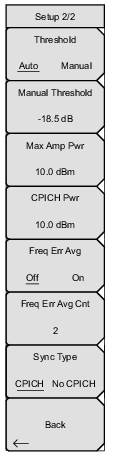 ![]() | Threshold: Sets the measurement threshold to be set either automatically by the instrument or manually by the user. Manual Threshold: Change the measurement threshold manually by entering a desired value and pressing Enter. Max Amp Pwr: Sets the maximum transmit power of the base station. CPICH Pwr: Sets the power of the CPICH. Freq Err Avg: Turns on averaging for the frequency error measurement. Freq Err Avg Cnt: Sets the number of measurements to use in the frequency error averaging calculations. The number can be set from 2 to 15. Sync Type: Selects between CPICH or No CPICH for synchronization. Back: Returns to the Setup 1/2 Menu. |